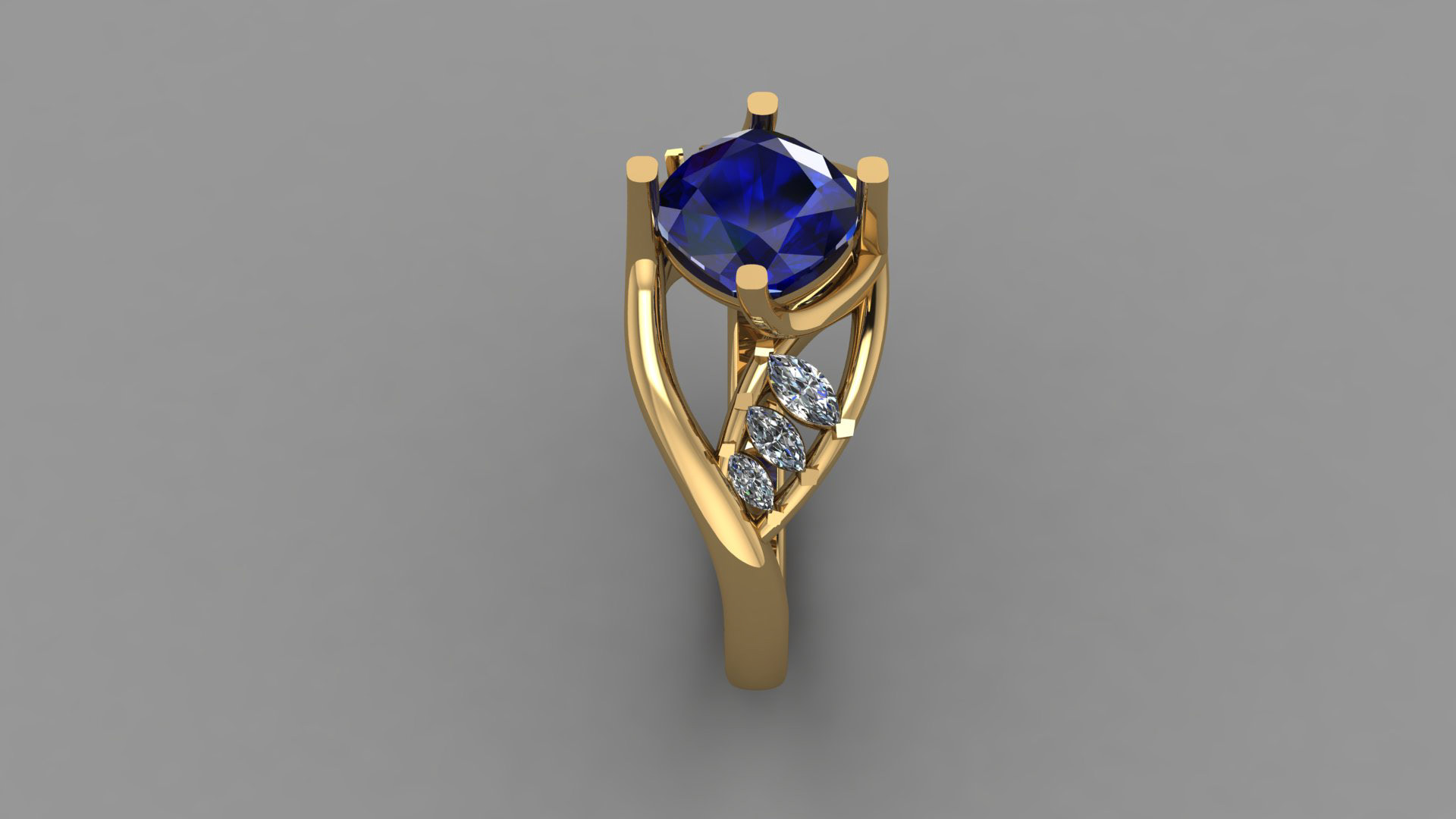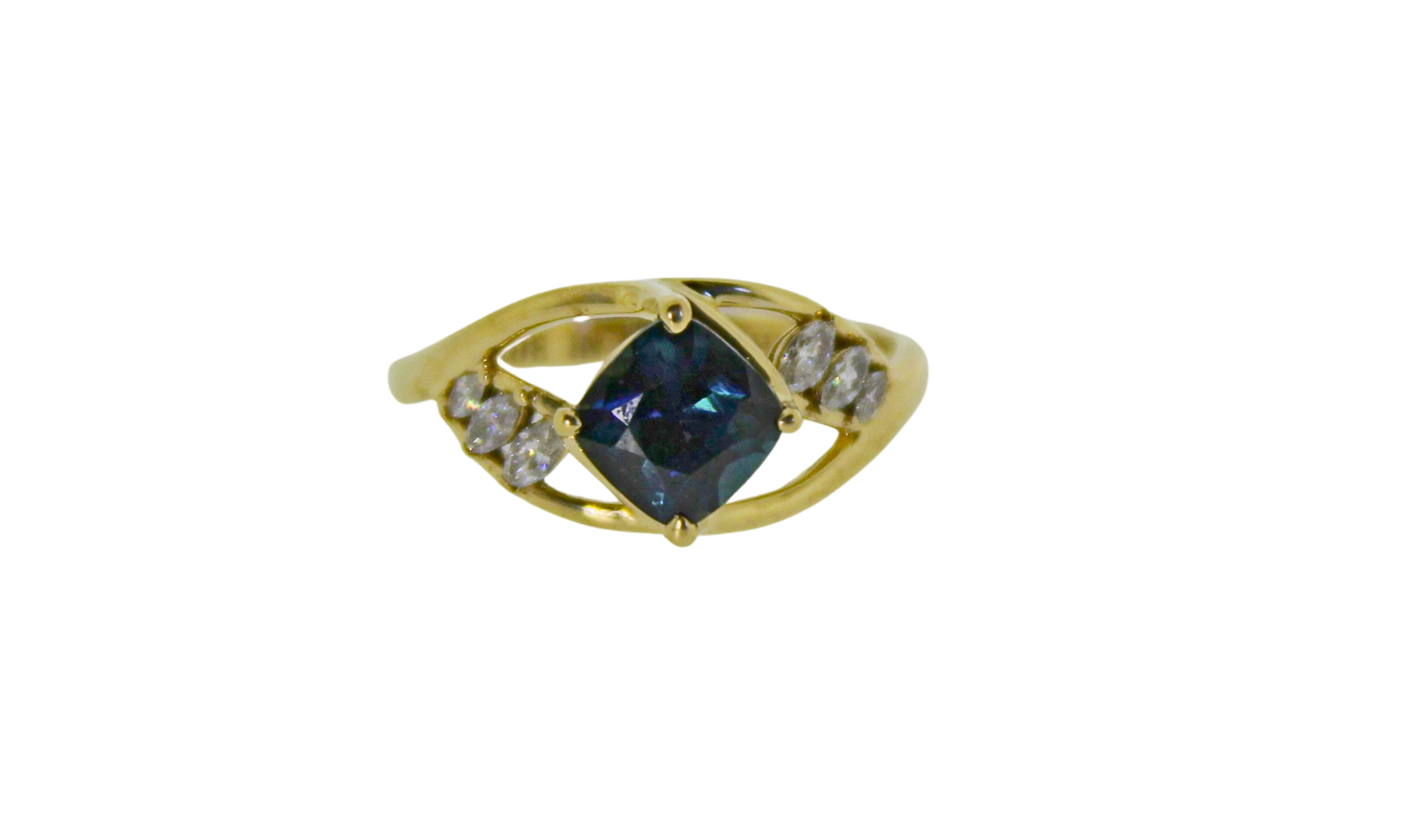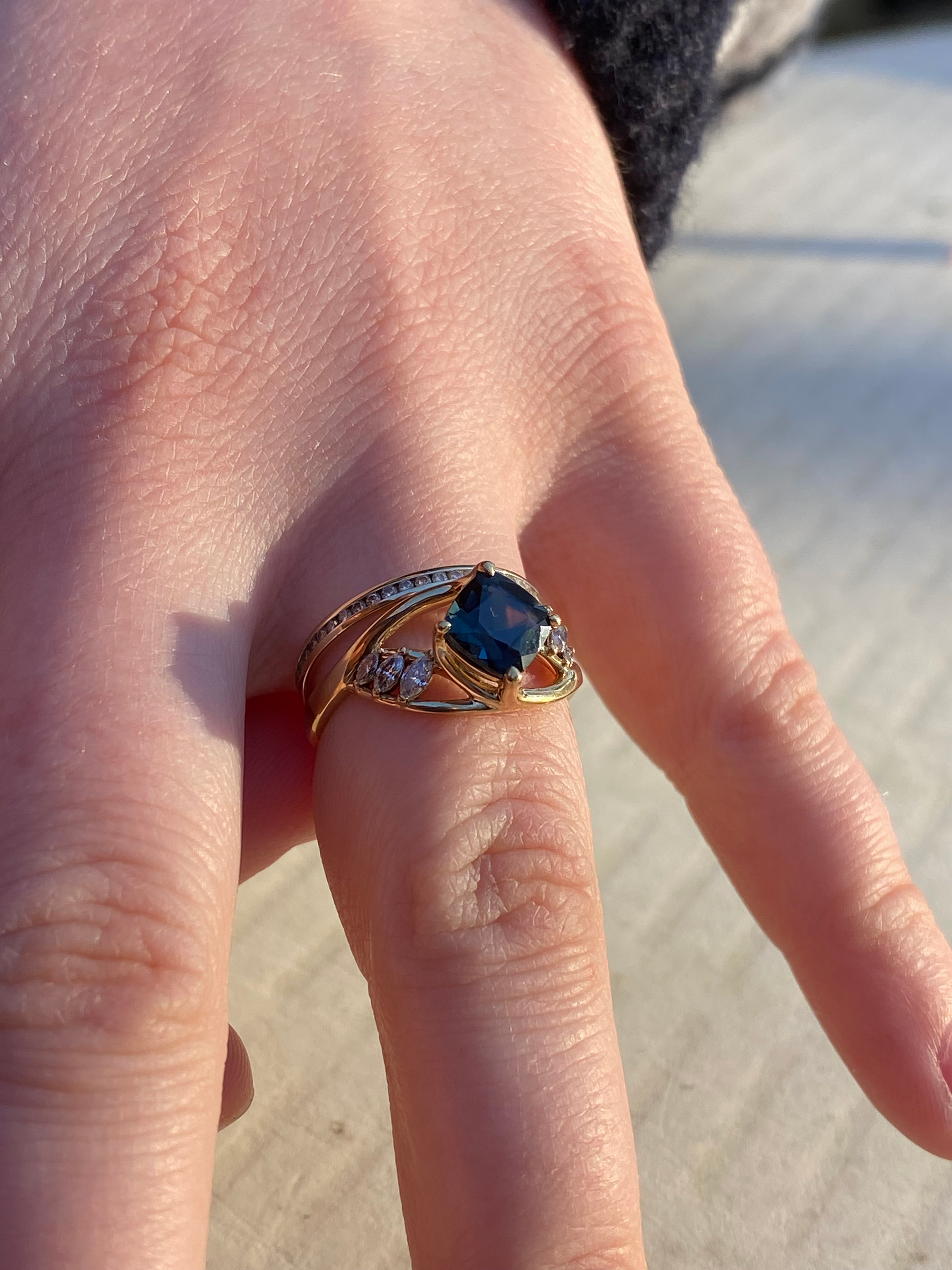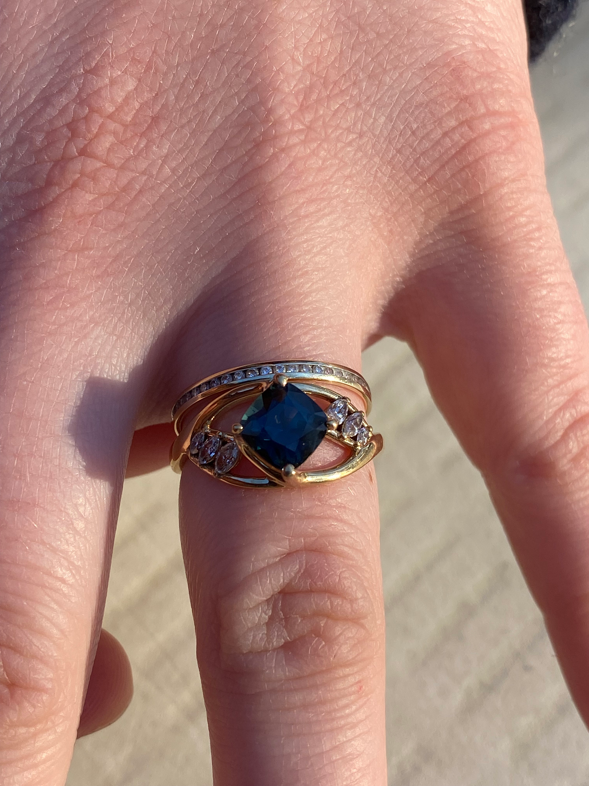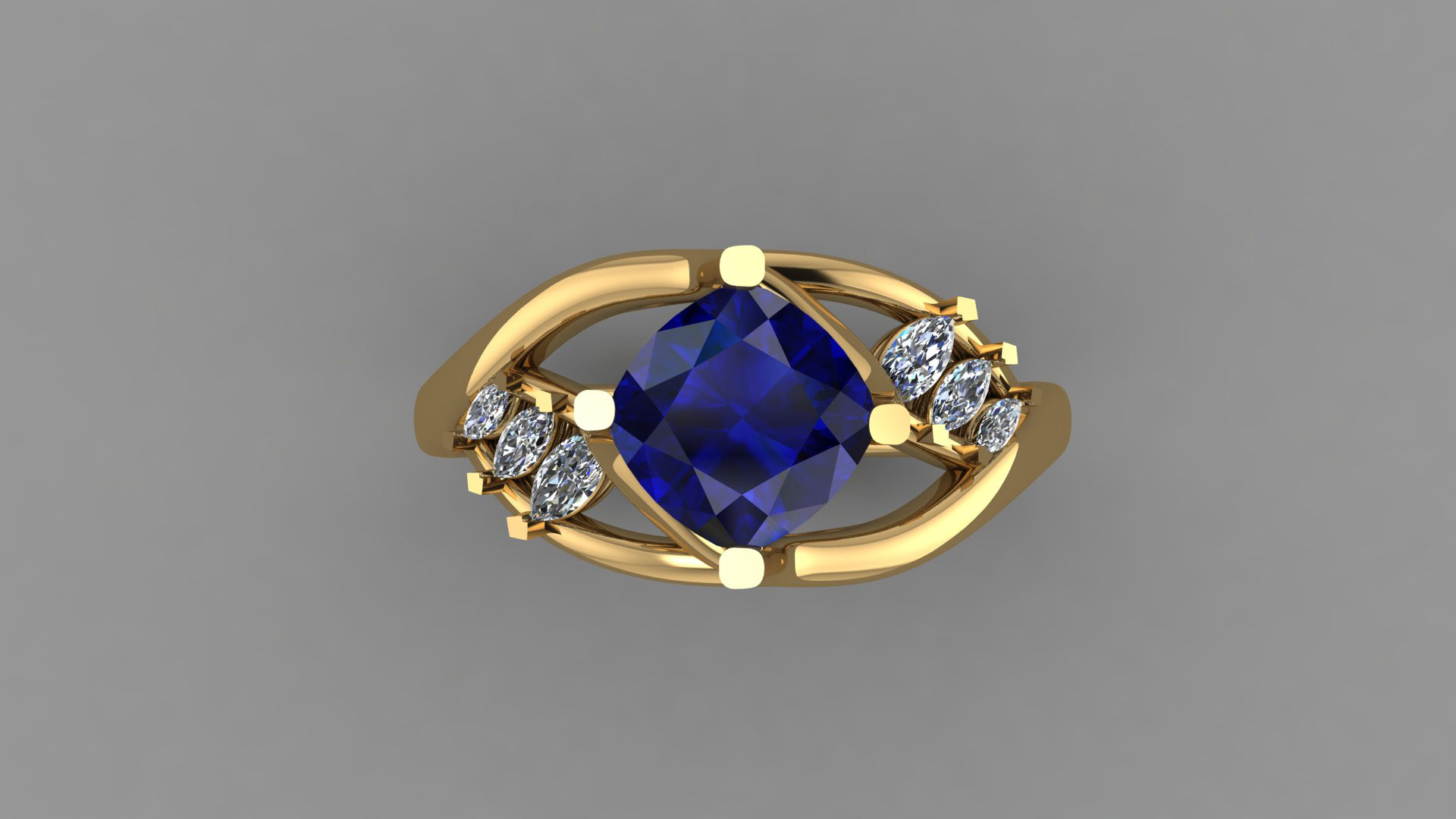 Designed in collaboration with manufacturers Pure Imagination Jewellers, this engagement ring features a 1.7 carat Australian sapphire, with six marquise diamonds arranged around an 18k gold band.