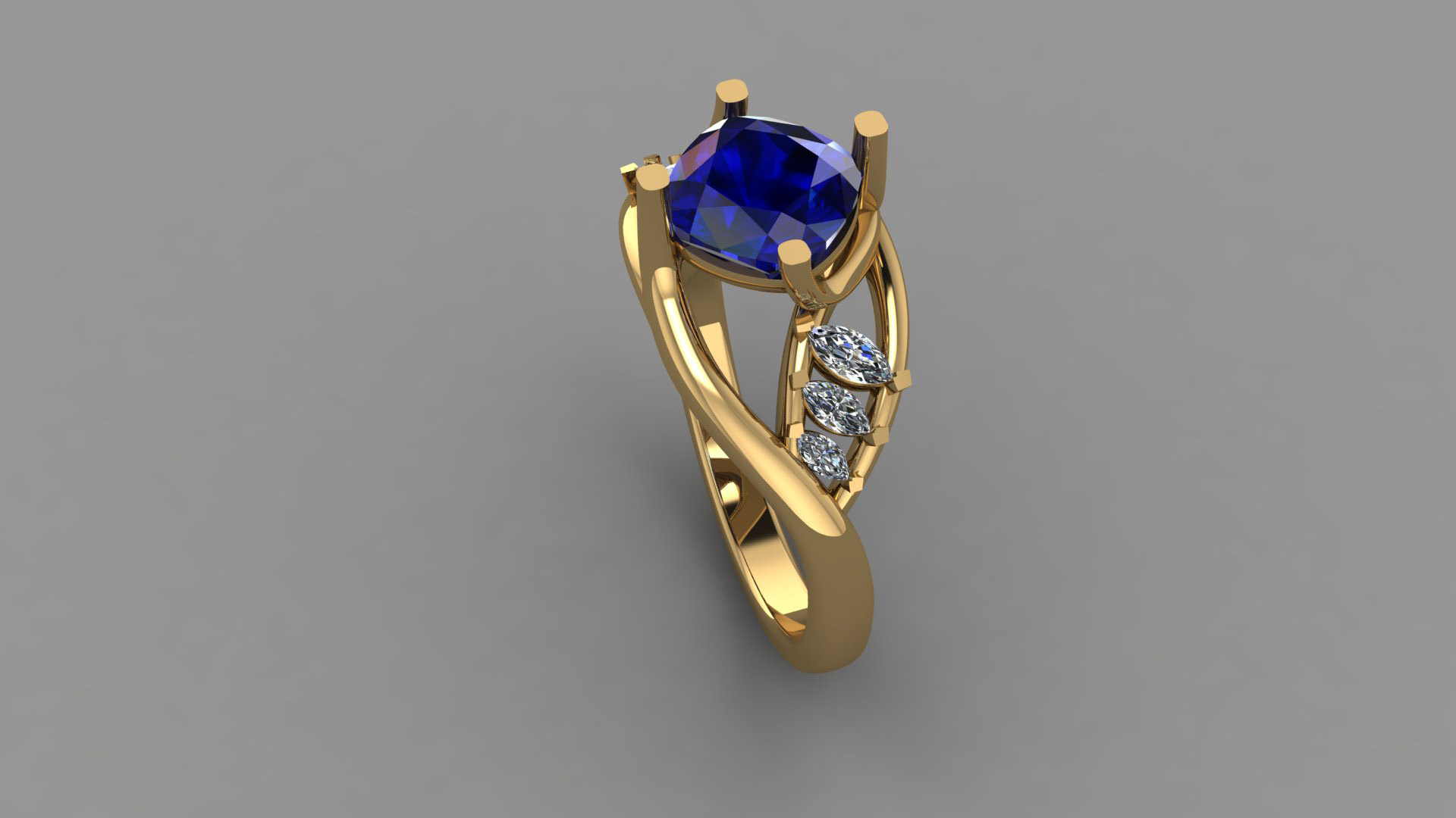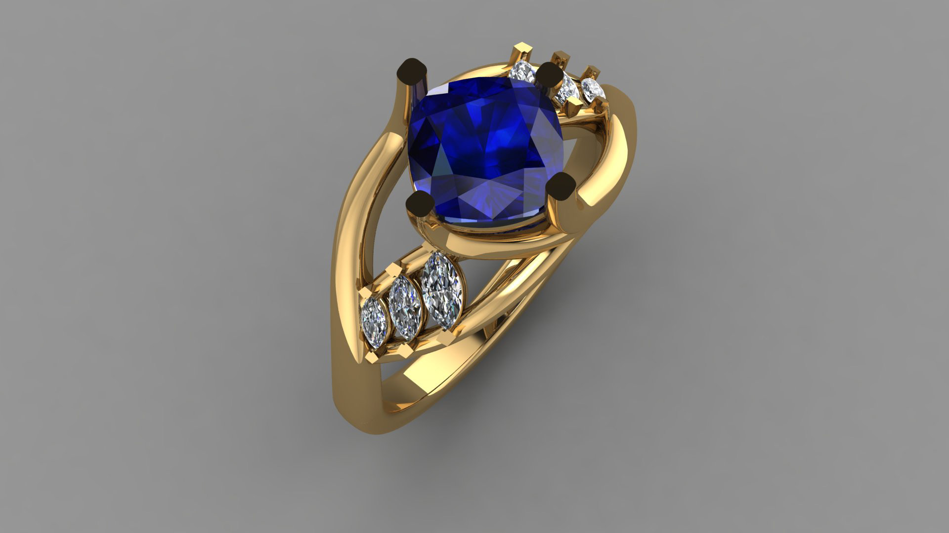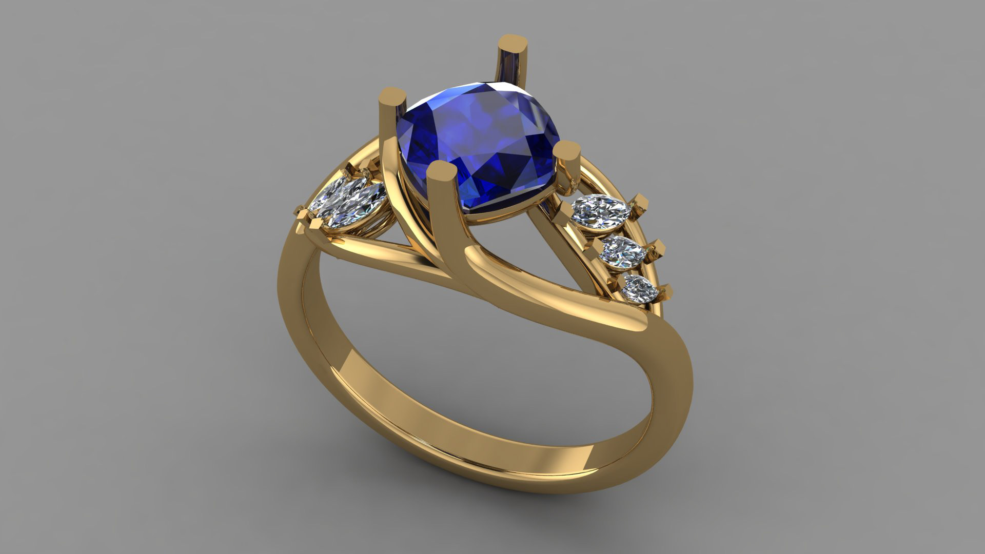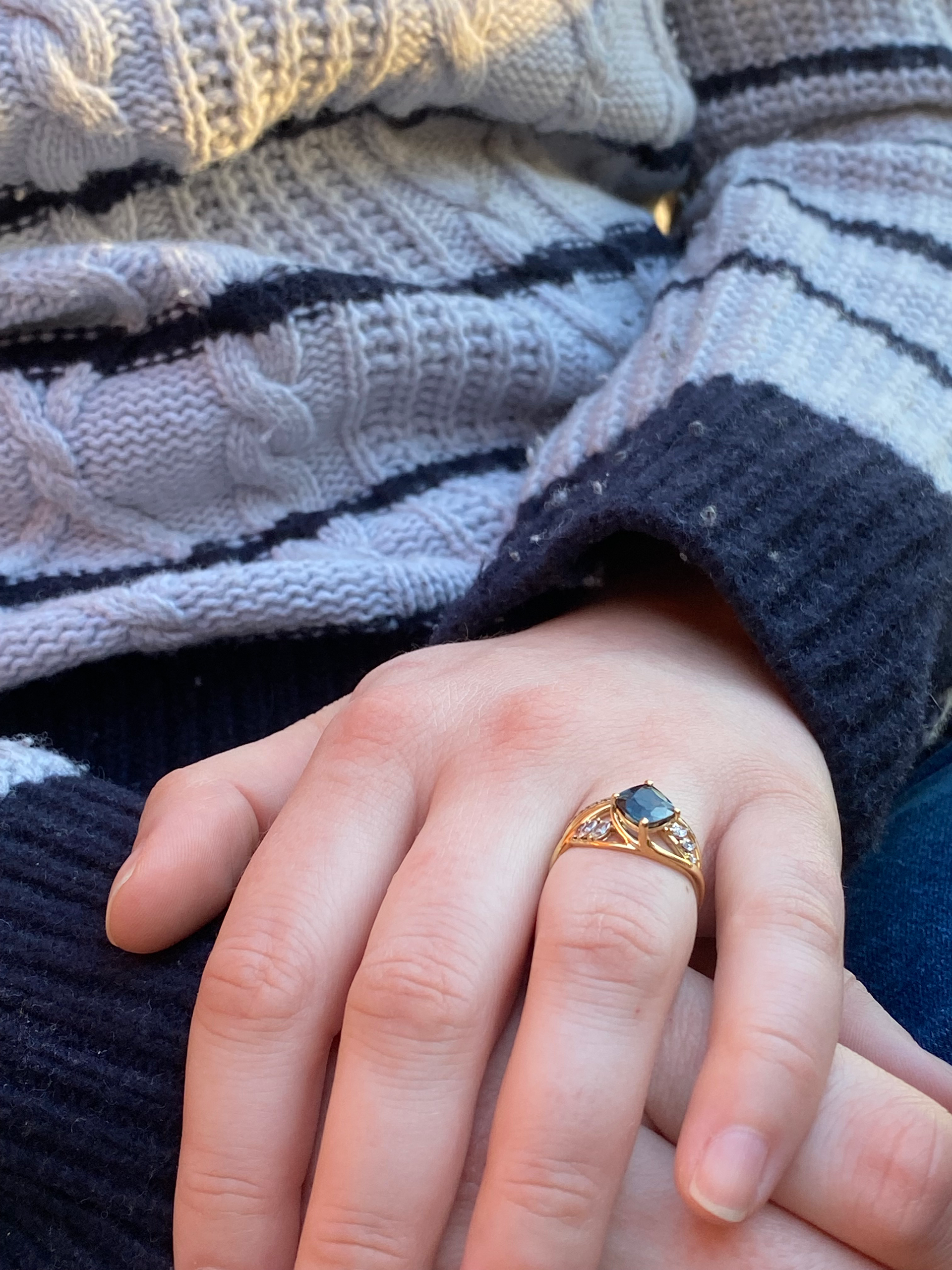 Designed in collaboration with manufacturers Pure Imagination Jewellers, this engagement ring features a 1.7 carat Australian sapphire, with six marquise diamonds arranged around an 18k gold band.