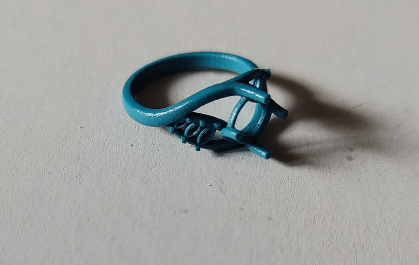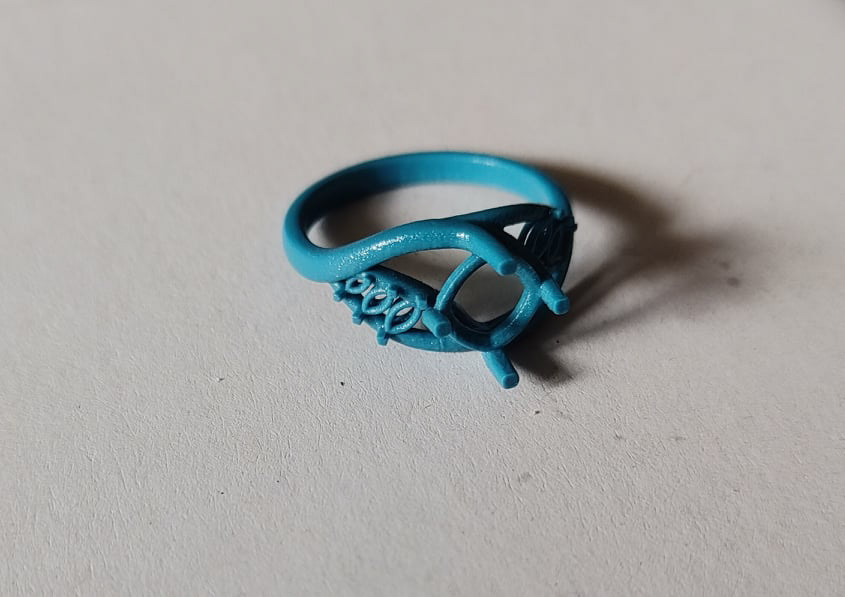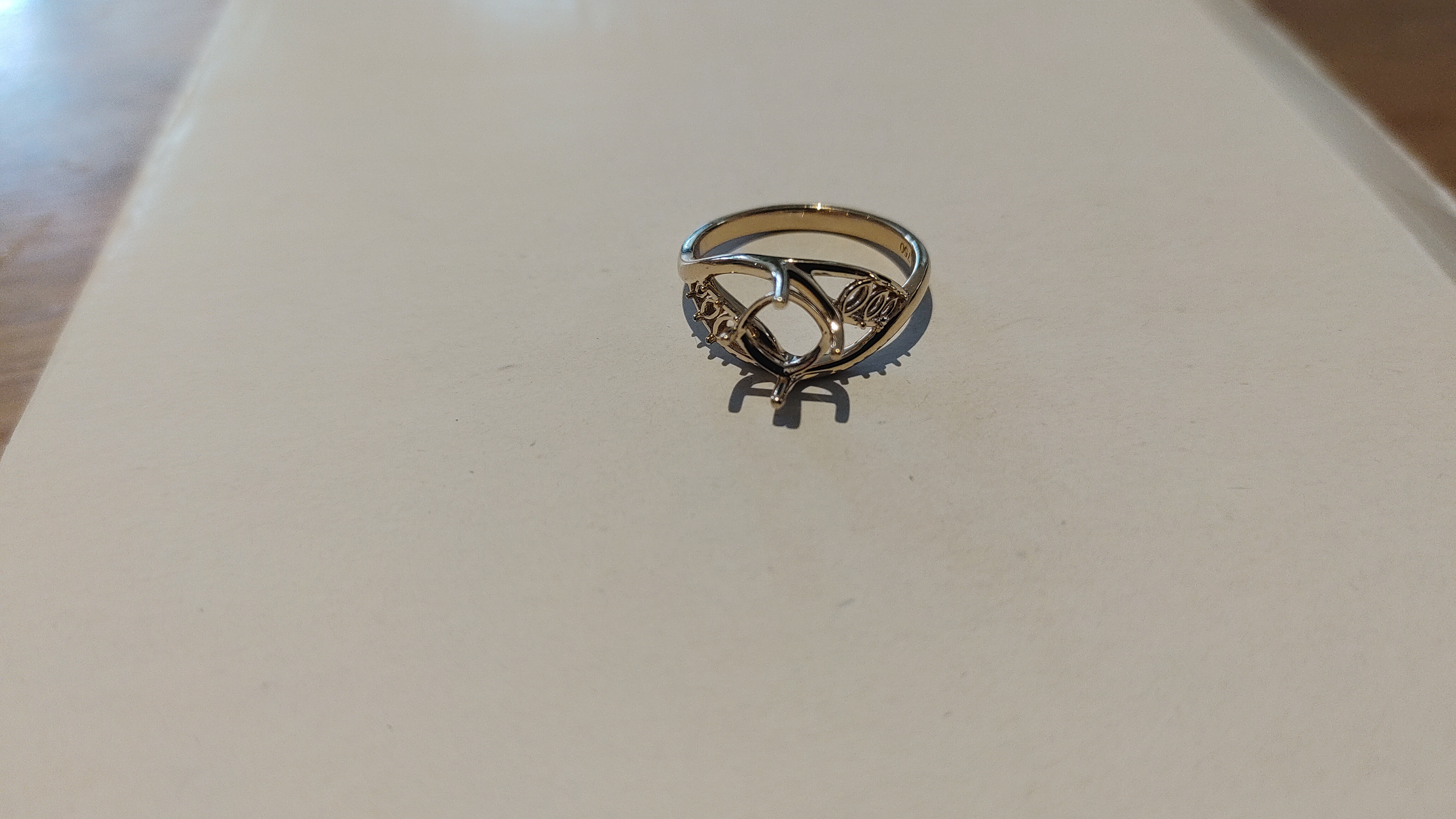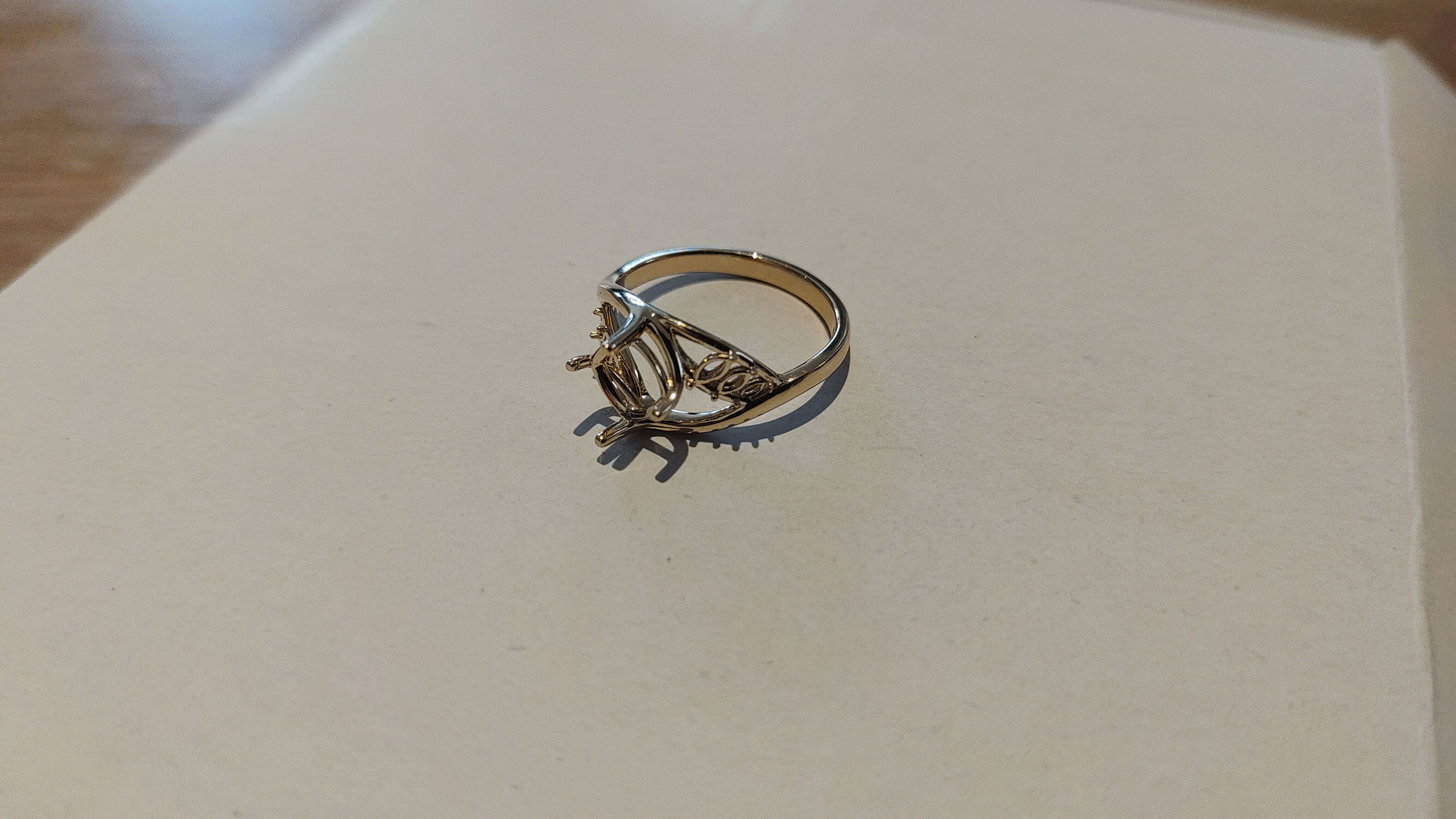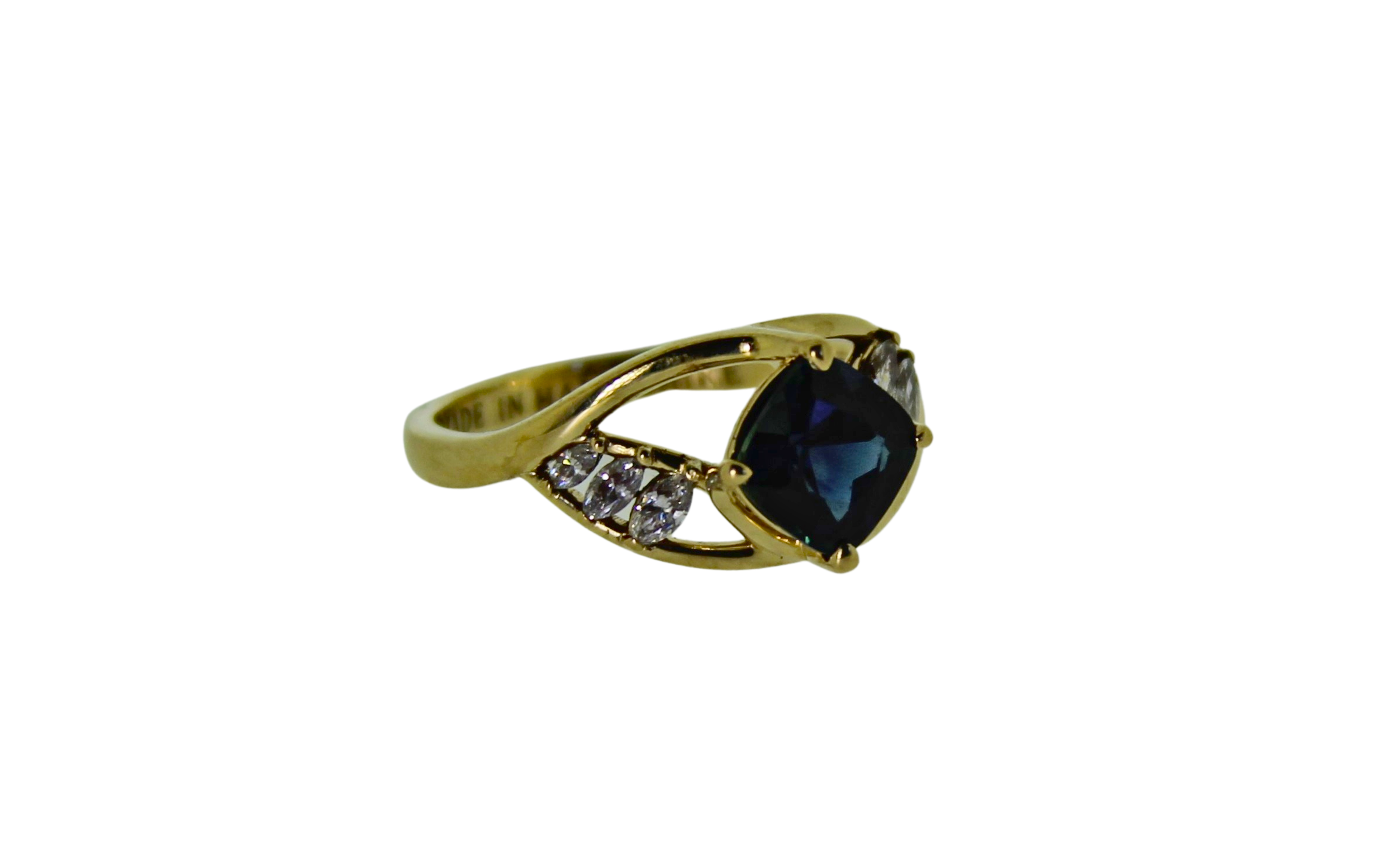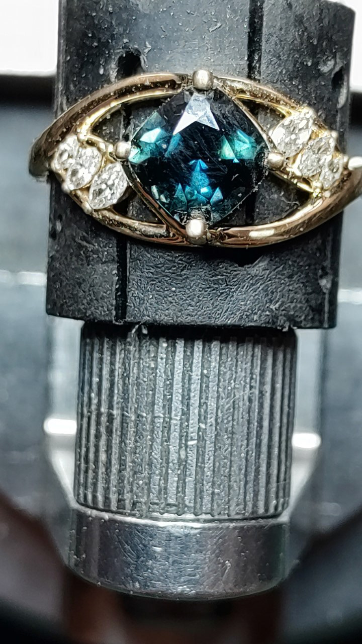 Designed in collaboration with manufacturers Pure Imagination Jewellers, this engagement ring features a 1.7 carat Australian sapphire, with six marquise diamonds arranged around an 18k gold band.